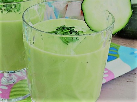 Crema fria de aguacate, pepino, apio, lima, agua, sal, y pimienta
